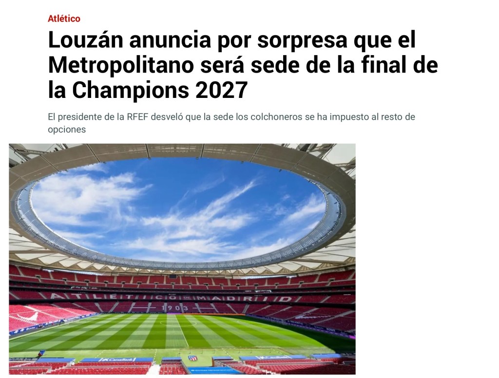 ALucinante… ahora resulta que el Metropolitano va a ser la sede de la final de la Champions 2027, sin que el Atleti ni siquiera haya terminado de presentar la documentación para solicitarlo… raro, no?